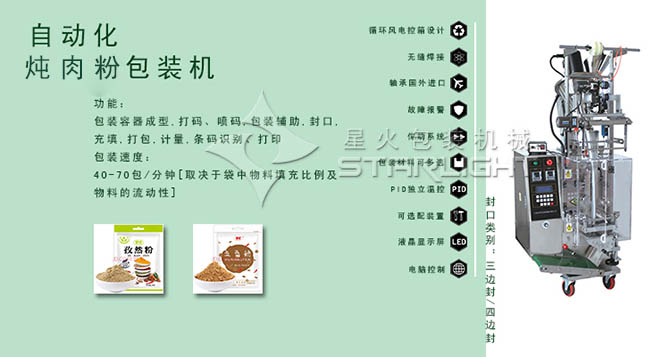 燉肉粉包裝機/燉雞料包裝機廣泛適用于孜然粉、燉肉粉、肉香粉、生姜粉、胡椒粉、花椒粉、小蘇打、玉米淀粉、木薯粉、辣椒粉、椒鹽粉等粉末狀產(chǎn)品的包裝,燉肉粉包裝機的使用能保障包裝過程中不灑漏。