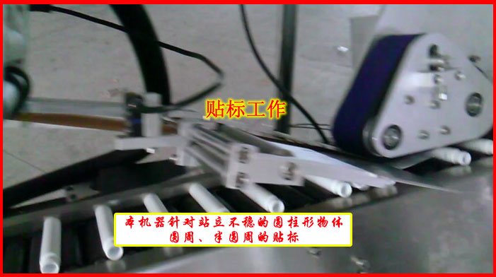 工作流程:人工把產品統一方向送至送料器----送料器自動輸送產品進入輥筒鏈條輸送帶上----電眼檢測貼標工作-----產品旋轉貼標加固-----成品輸出。